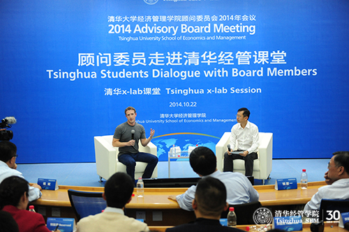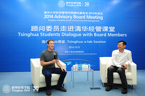On the evening of October 22, the new member of the Advisory Board of Tsinghua University School of Economics and Management, Mark Zuckerberg, Founder and CEO of Facebook, was invited to have a dialogue with Tsinghua x-lab’s students. During the session, Zuckerberg spoke entirely in Chinese, which thrilled the audience. He remarked that this is his first time public speech in Chinese, which made the session more special and unforgettable for the students present. Professor QIAN Yingyi, Dean of Tsinghua SEM, hosted the dialogue session and Professor CHEN Jining, President of Tsinghua University, concluded the session with remarks. “Tsinghua Students Dialogue with Board Members” is one of the series of activities prior to the Tsinghua SEM Advisory Board meeting; the aim is to create an intimate environment for students to have an up-close and in-depth interaction with board members.