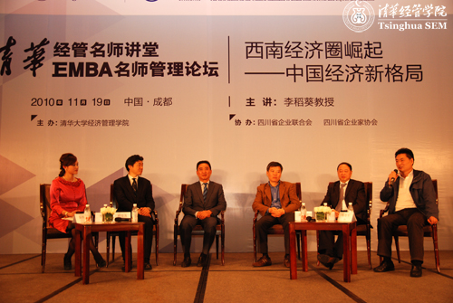 In a speech delivered before the faculty forum in Chengdu, HUANG Xiaoxiang, Vice Governor of Sichuan Province, suggested three possible ways of collaboration for Tsinghua University and Sichuan Province: to conduct long-term cooperation in specific areas such as decision-making consulting, financial services, corporate management, marketing and human resources development; to establish platforms of talents development, including seminars, research projects and lectures; to invite more EMBA entrepreneurs to locate business opportunities in Sichuan and contribute investments.