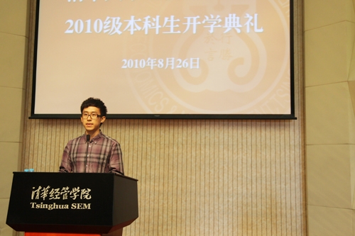 The first speaker at the ceremony was SEM’s Student Union President LIN Wenchen, who began his speech with the following question: “what do you want out of the next four years?” He suggested the freshmen to take initiatives in the planning of their campus life, making full use of the opportunities and platforms of SEM’s undergraduate education. Besides, he also reminded the audience of their social responsibility, quoting GU Binglin, President of Tsinghua University: Tsinghua students should “undertake grand careers and be the corner stone of China.”