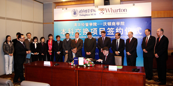 The Agreement is an achievement of Tsinghua SEM’s undergraduate exchange endeavors in its cooperation with the world’s top institutions. According to the Agreement, SEM and Wharton will begin exchanging undergraduate students to study in the other school for one semester since fall 2010.