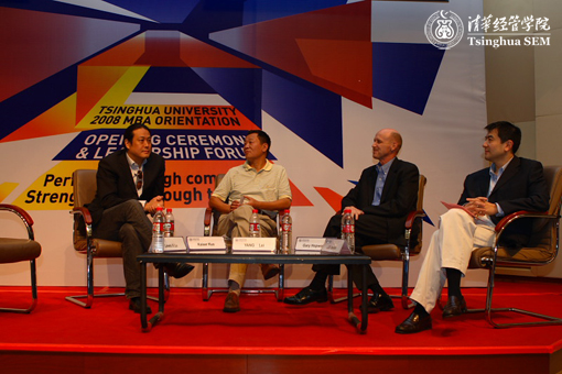 The forum with the theme of “leadership” was carried out right after the opening ceremony of 2008 orientation. Professor Lu Xiangqian, from the Department of Innovation and Entrepreneurship of Tsinghua SEM, hosted this forum. The attendees were Luo Jianfan, CEO of the PacLantic Co., Ltd., Guo Yiguang, the Strategy Director of Ogilvy Digital, senior adviser Yang Lei and human resources expert Gary Hopwood from Northern Light Venture Capital.