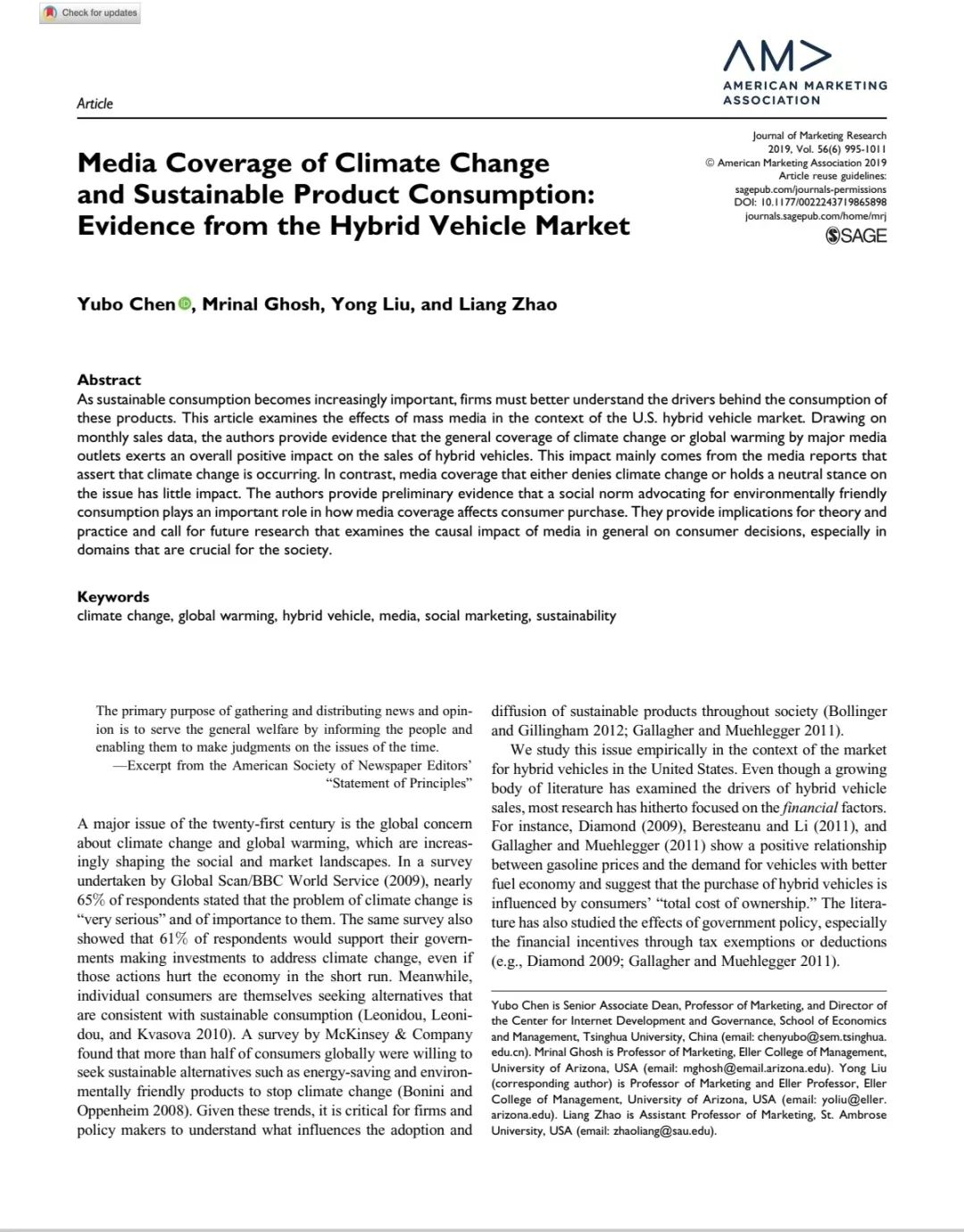 "Media Coverage of Climate Change and Sustainable Product Consumption: Evidence from the Hybrid Vehicle Market" co-authored by CHEN Yubo and his collaborators is published on Journal of Marketing Research.