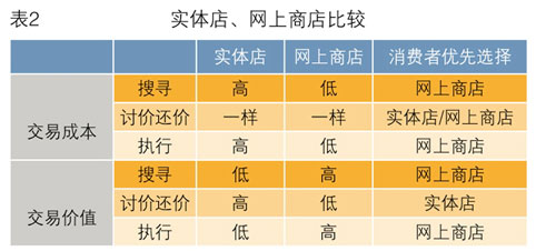 实体店和网上商店,在这三个过程中的交易价值和交易成本,就有所不同(见表2)。由于交易过程可分,如果环节之间切换成本不高,消费者就可以在不同环节选择不同的商业模式定位。消费者最合理的选择应该是在网店搜寻,去实体店讨价还价,最终在网店下单购买,执行交易。对企业而言,也可以在这几个环节之间切割重组,成为兼具网店和实体店的混合商业模式定位。钻石小鸟从做网店起家,后来为了形象展示和客户体验,也开启实体店,实现客户在网上搜寻、在实体店讨价还价、在网店执行交易的混合定位。