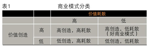 按照价值创造和价值耗散的高低,商业模式可分为四大类(见表1):高创造,高耗散;高创造,低耗散;低创造,高耗散;低创造,低耗散。