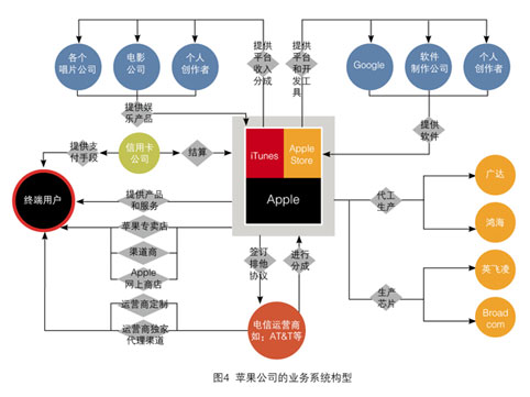 在苹果公司业务系统构型(见图4)中,苹果是硬件、软件和应用一体化平台,而它的利益相关者,有设备加工商(广达、鸿海等)、内容提供商(唱片公司、电影公司等)、服务提供商(信用卡公司、电信运营商等)等。
