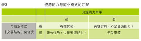 ● 资源能力优势和竞争优势是什么关系?一个企业的资源能力优势要转化成竞争优势,需要契合商业模式,也就是说,企业家和经理人需要重点关注这样一种资源能力,其水平超过市场平均水准,同时与企业的商业模式即交易结构契合度很高。我们称之为“有效优势”(见表3)。
