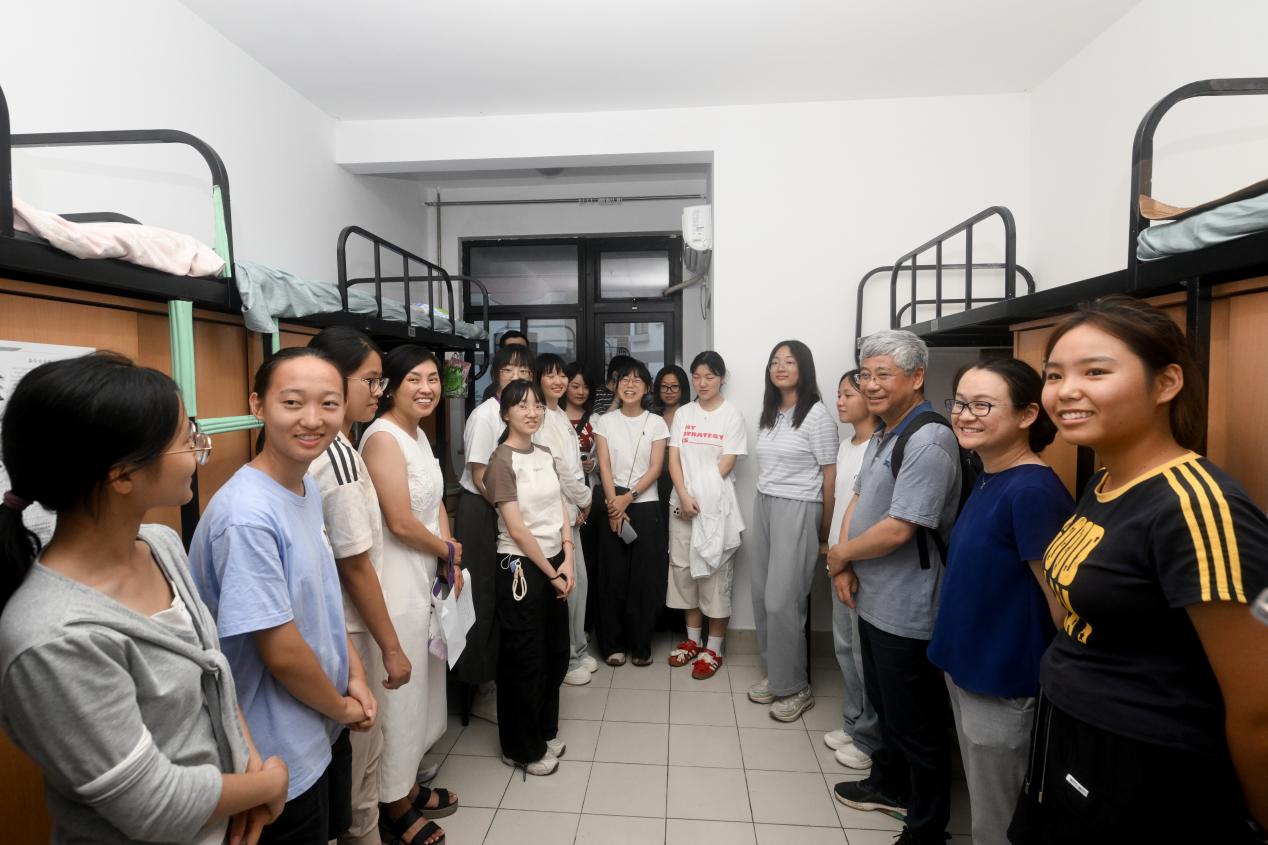 当晚,学院院长白重恩,党委书记薛健,党委副书记刘庆,院长助理林志杰、张晨,新生班主任郭迅华、郭依迪、蒋若青,以及学院相关部门负责人一行来到学生宿舍,看望刚刚安顿下来的2025级新生。老师们详细询问了新生们初入清华园的感受,鼓励他们积极融入校园生活。新生们也纷纷表达了自己对未来大学生活的期待,同时就即将开始的大一学习生活,与老师们进行了沟通交流。