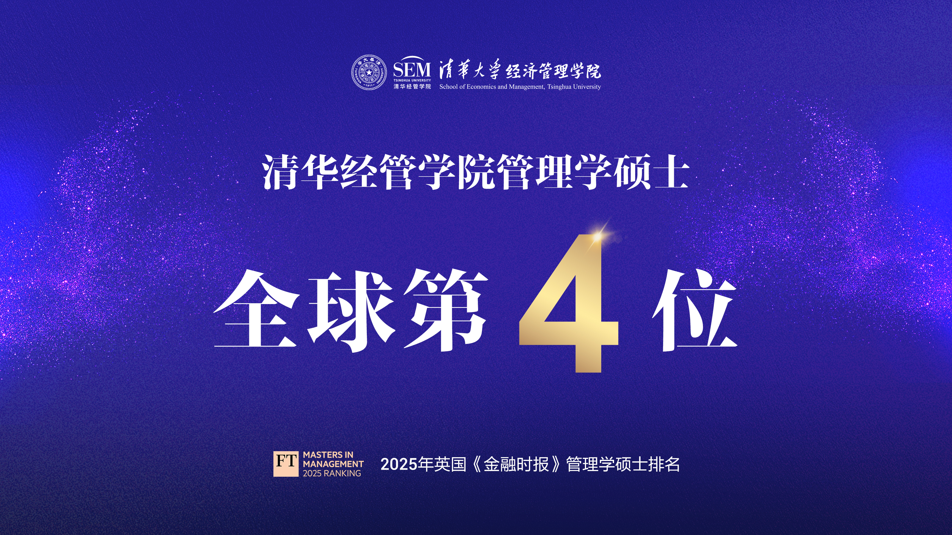 在刚刚发布的2025年FT管理学硕士排名中,清华经管学院管理学硕士项目位列全球第4,亚洲第1,再次刷新亚洲院校该项目排名的最高记录。其中,“目标达成度”全球第1,“项目性价比”全球第2,“校友网络”全球第3,“薪酬涨幅”全球第4。