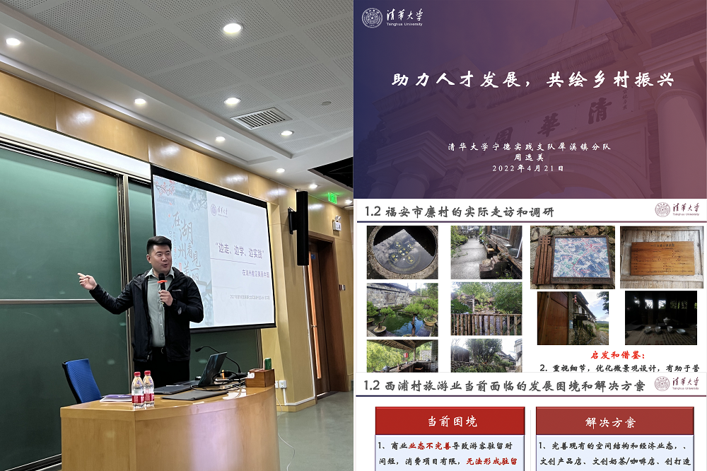 2021年参加学校支队并获得社会实践奖学金、目前在新加坡交换的学院管科系18级博士生周逸美以“助力人才发展,共绘乡村振兴”为题,在线分享了她在福建宁德基地实践过程中体验基层工作、助力乡村振兴再出发的历程与经验感悟。担任学院浙江湖州基地支队队长、也获得社会实践奖学金的组织系18级博士生左文超以“边走、边学、边实践——在湖州看见美丽中国”为题,分享了高效完成实践项目的同时,他在湖州深入企事业单位和基层调研、组织开展主题教育的工作成果和清华人要“走在前、做表率”的心得体会。