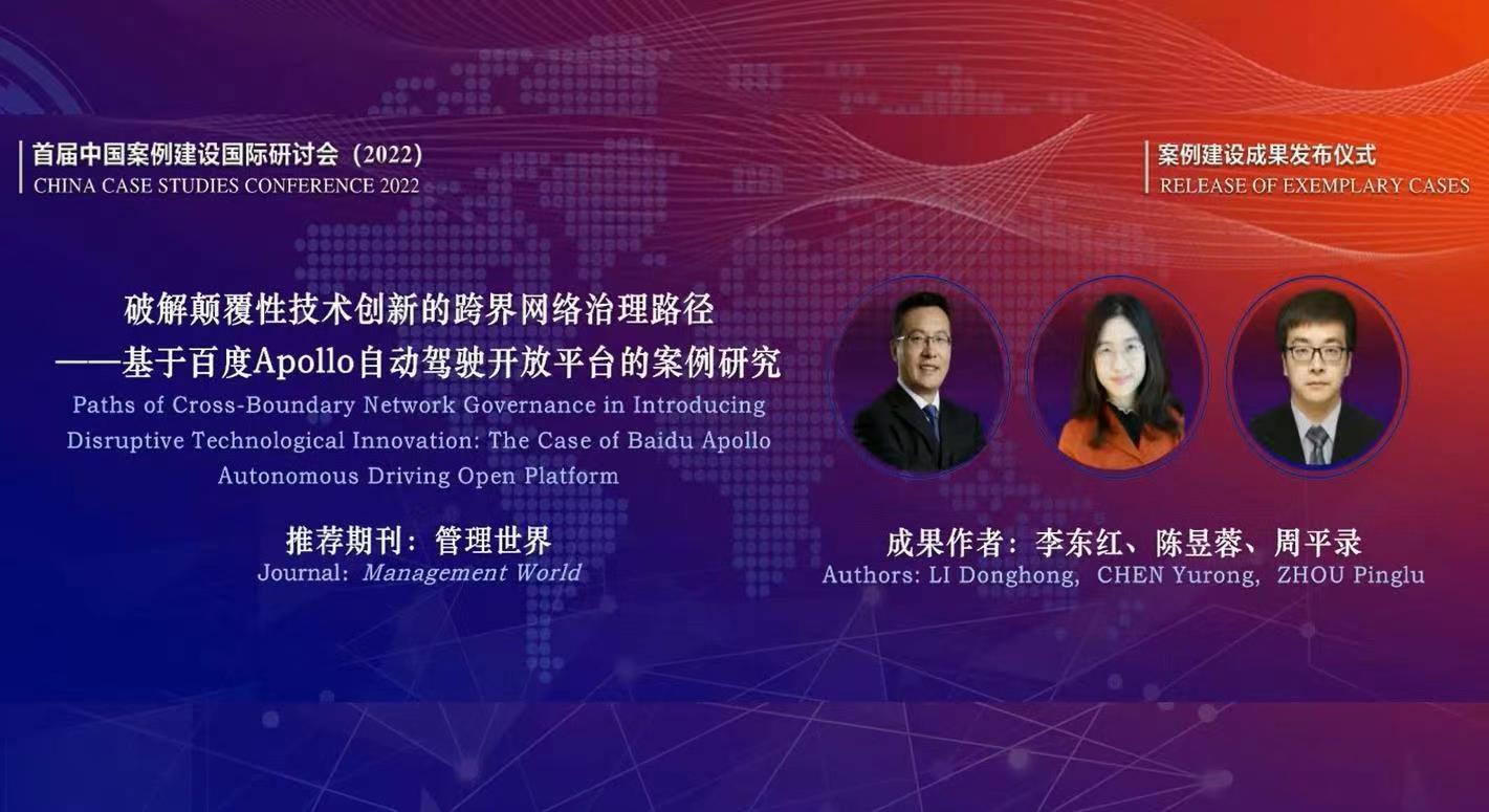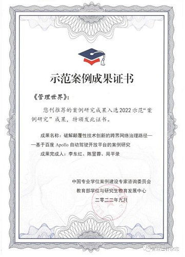 2022年9月17日,由教育部学位与研究生教育发展中心、永利集团88304官网在线登录公共管理学院联合主办的首届中国案例建设国际研讨会(2022)举行。会议期间首次发布了“案例研究”典型成果和“主题案例”典型成果。清华经管学院创新创业与战略系李东红教授团队发表的论文《破解颠覆性技术创新的跨界网络治理路径——基于百度Apollo自动驾驶开放平台的案例研究》获评2022年示范“案例研究”成果。