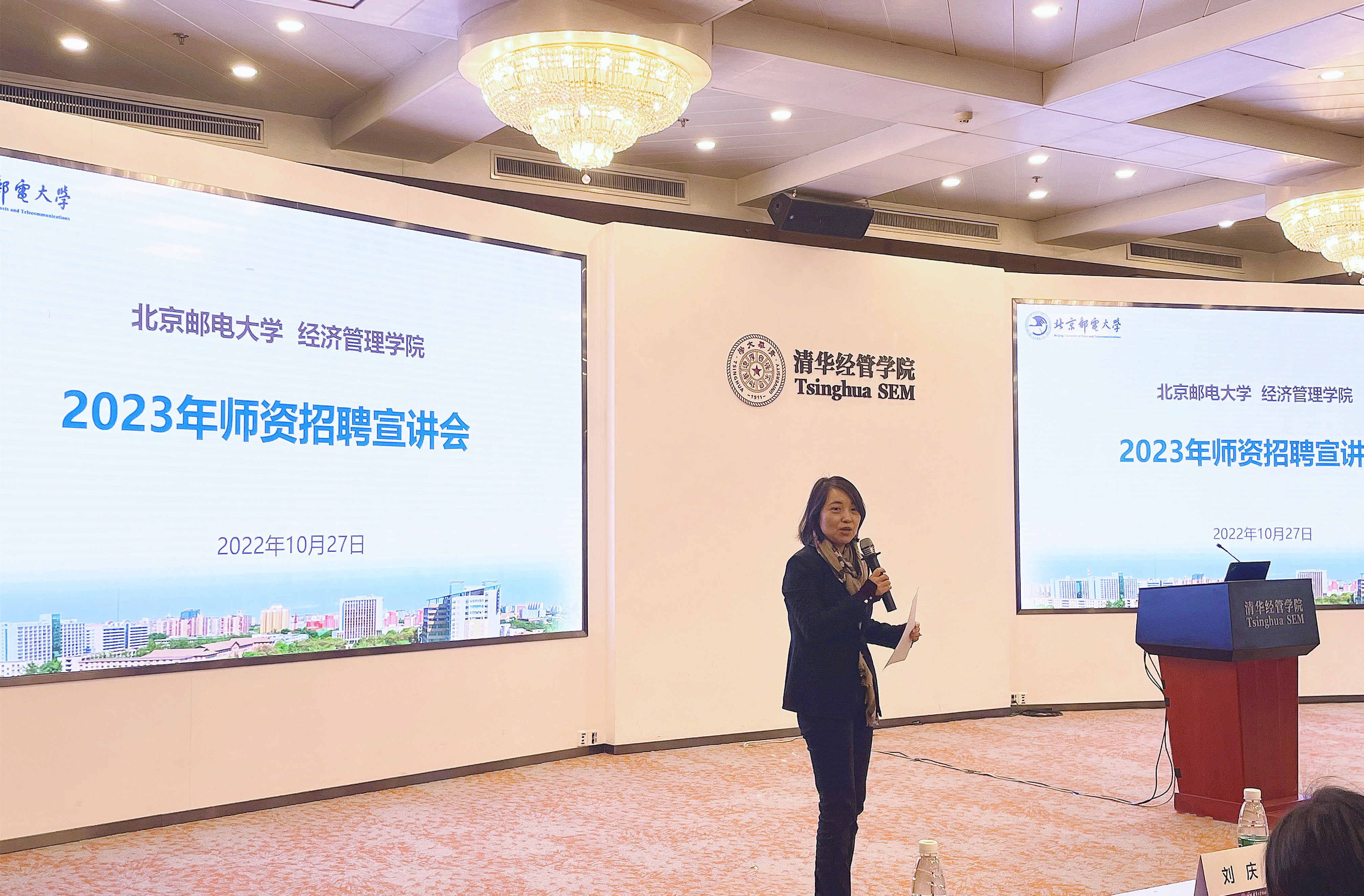 2022年10月27日,北京邮电大学经济管理学院(以下简称北邮经管学院)2023年师资招聘宣讲会在清华经管学院举行。本次招聘宣讲会由北邮经管学院院长何伟、北京邮电大学人事处处长闫强带队,北邮经管学院副院长赵晨、办公室主任李靖璇、管理科学与工程系系主任万岩、工商管理系系主任王砚羽、应用经济系系主任李宏兵和公共管理系系主任许冠南一同参加。清华经管学院副院长何平、院长助理迟巍、党委研究生工作组组长刘庆、管理科学与工程系党支部书记郭迅华、职业发展中心主任顾英杰和清华经管学院来自不同专业的50余名博士生参与本次宣讲会。