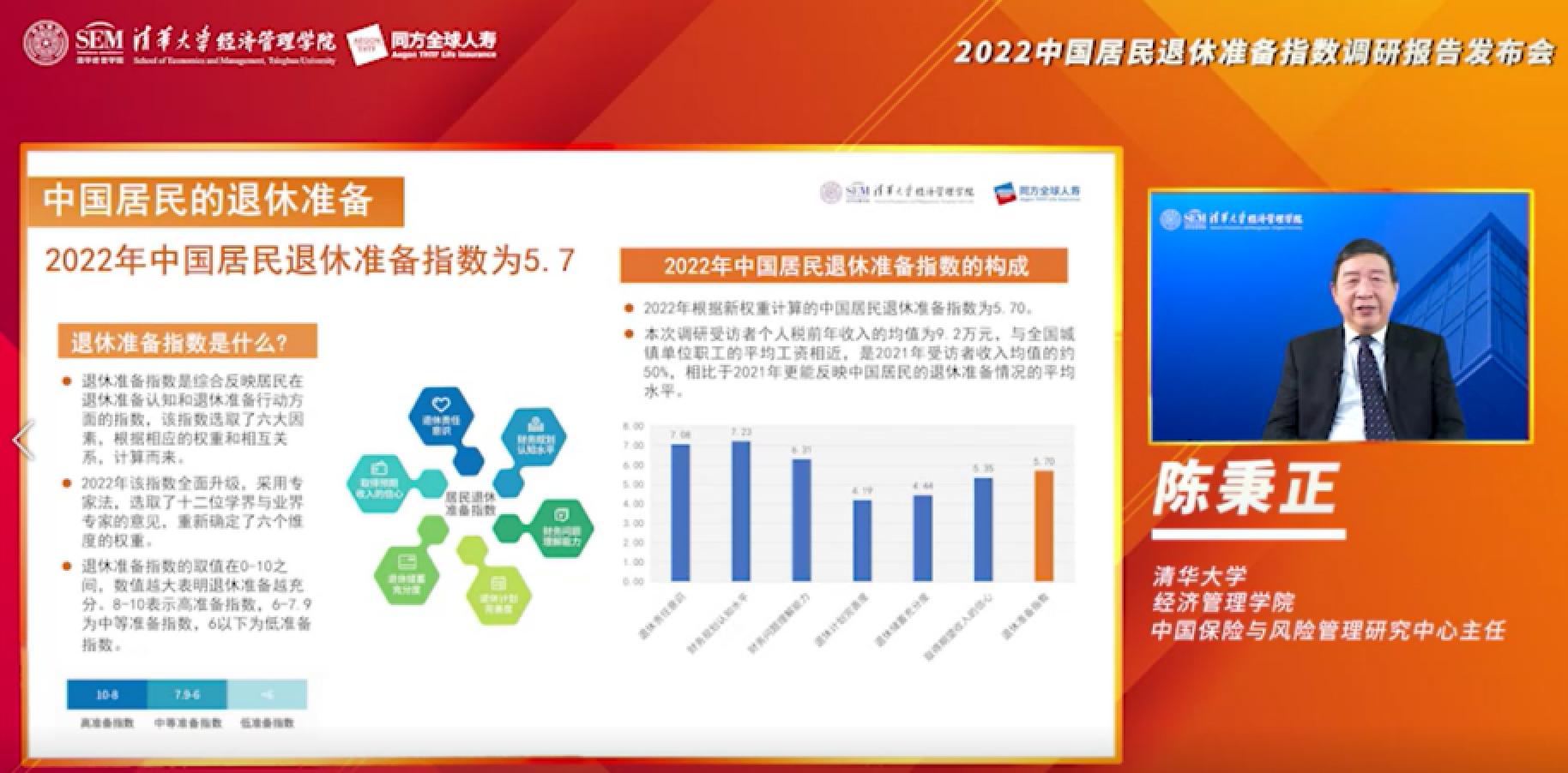 2022年12月27日,由永利集团88304官网在线登录中国保险与风险管理研究中心(以下简称“研究中心”)和同方全球人寿保险有限公司(以下简称“同方全球人寿”)共同主办的2022中国居民退休准备指数调研报告(以下简称“报告”)发布会通过线上直播方式举行。发布会上揭晓了今年中国居民退休准备指数为5.7,该指数反映了中国居民退休准备情况的平均水平。研究中心主任陈秉正、同方全球人寿总经理朱庆国出席本次发布会。