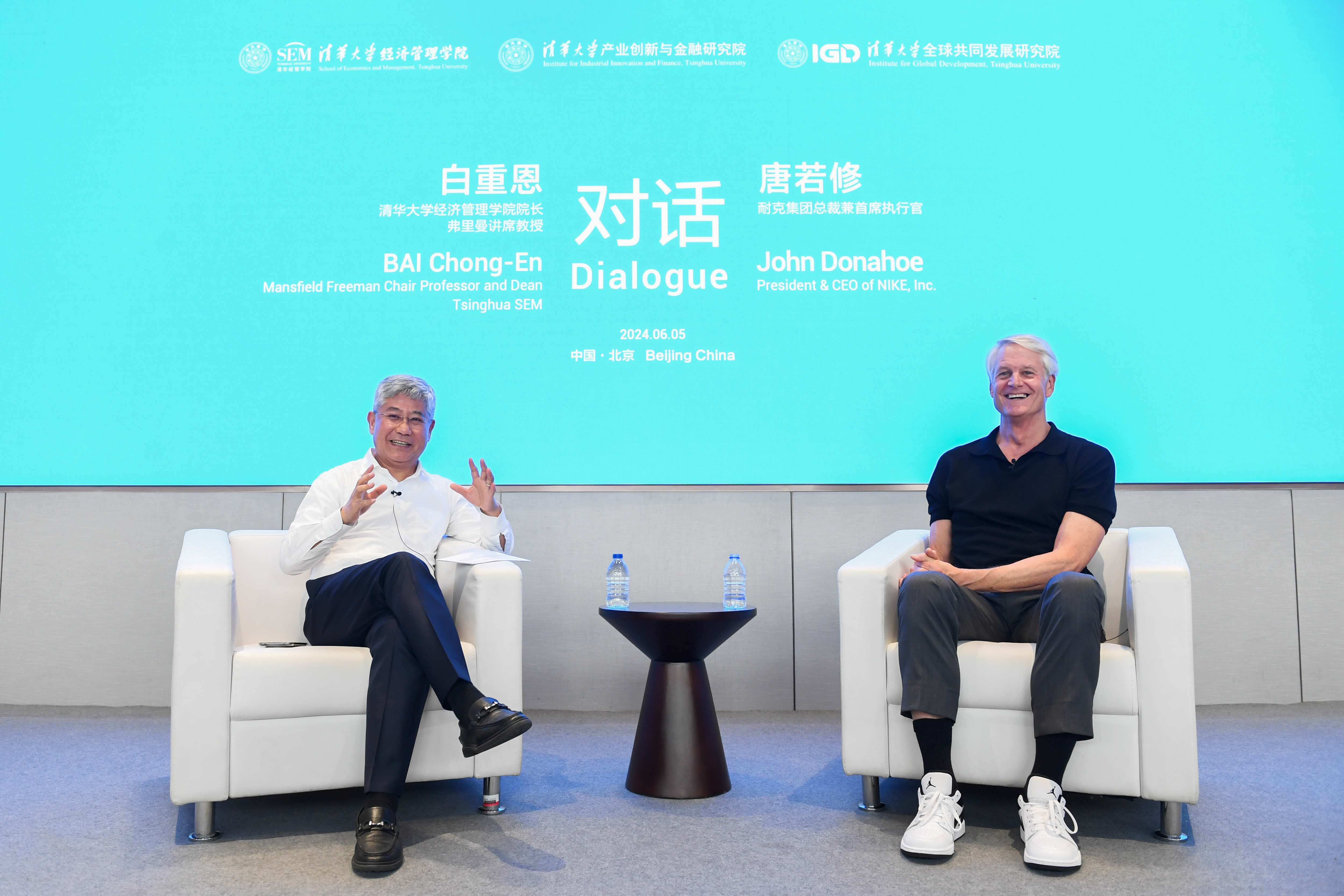在经管学院,唐若修与白重恩院长展开精彩对话,并与数百名清华学子进行互动交流,探讨领导力、运动在当今世界扮演的角色,创新日益突出的重要性,协作如何推动可持续发展等话题。