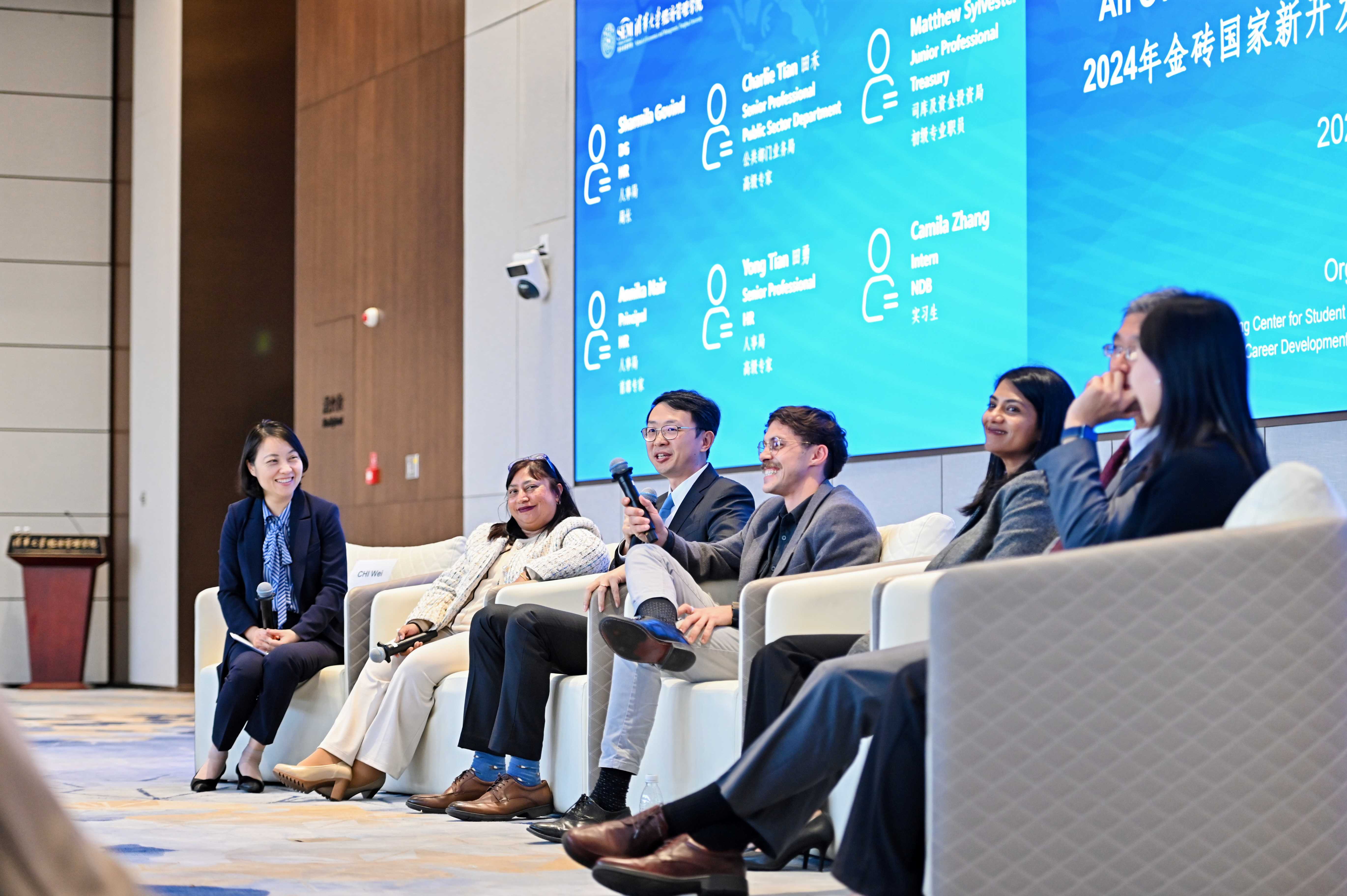 之后,新开发银行主权业务局高级专家田禾分享了新开发银行在可再生能源、社会基础设施、数字化等领域的工作。初级专业职员马修·西尔维斯特(Matthew Sylvester)、实习生卡米拉(Camila Zhang)分别分享了在新开发银行任职和实习的经历。