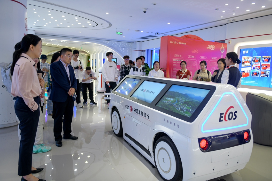 随后,师生们前往中国工商银行北京金融街支行,参观智慧银行特色服务设施。该网点以“金融+科技+生态”三位一体发展理念为目标,着力打造新一代智慧银行旗舰网点。工作人员介绍了工行自主研发的智能机器人“小融”,并现场展示机器人如何与大家进行聊天互动并完成业务问询。同学们围绕网点业务场景,对远程协同智能柜员机等智能设备进行互动体验,体会到科技赋能在优化服务流程、提升服务效率与用户体验方面的实际应用。