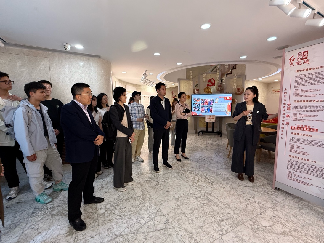 实践首站,师生们来到了西城晶华党群服务中心,通过“晶心”“晶准”“晶彩”三个维度,了解楼宇中红色阵地的建设亮点。中心工作人员为师生们详细讲解了立体化呈现的“金融街党群服务地图”,党群服务的“丰富菜单”以及为新业态群体提供的“赋能课堂”。同学们认识到党群阵地在服务创新中的平台作用,对厚植党建根基,集聚党建动能的实践路径有了更深刻的认知。