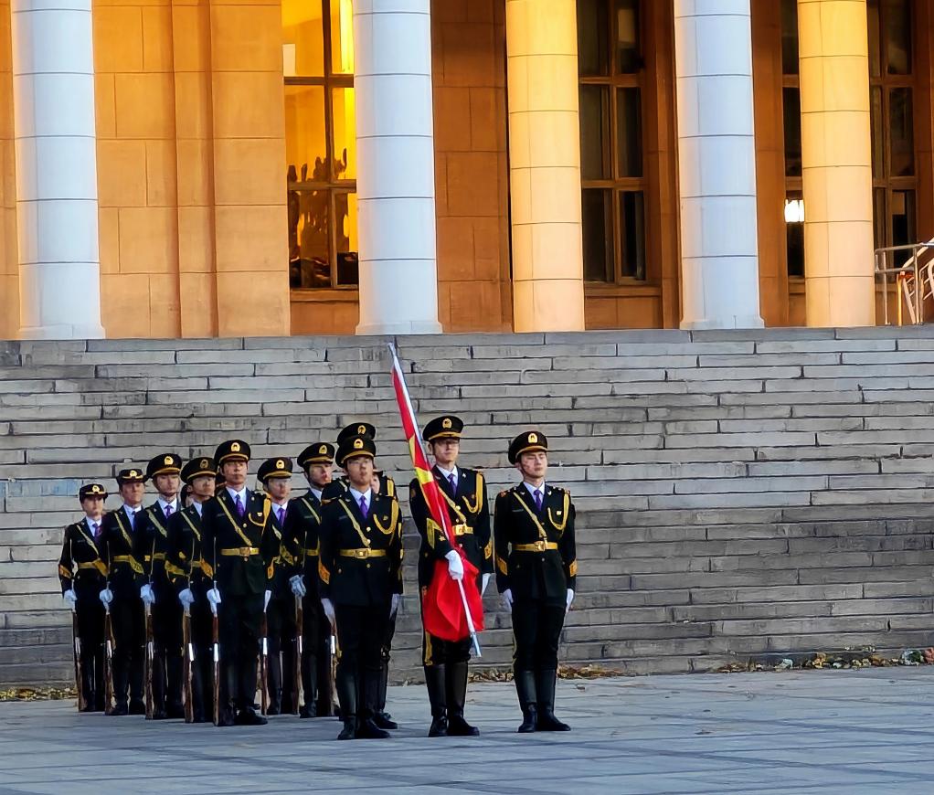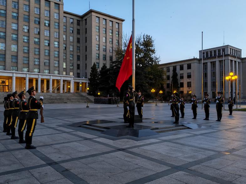 随着晨光渐亮,升旗仪式正式开始。英姿飒爽的国旗仪仗队步履坚定,目光如炬,他们迈着铿锵有力的步伐,护卫着五星红旗,从主楼台阶稳步走向升旗台。在庄严的国歌声中,鲜艳的五星红旗冉冉升起,迎风舒展于清华园的上空。全体新生肃立行注目礼,目光追随缓缓上升的五星红旗。