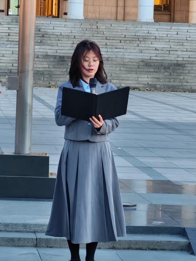 升旗仪式上,经54班张新怡作为学生代表发言。她以不久前班级赴北京市丰台区参访的经历为引,生动描绘了从庄严肃穆的中国人民抗日战争纪念馆到蓬勃发展的丽泽金融商务区所构成的“时光隧道”。她谈到,在抗战纪念馆中,同学们为民族救亡的艰苦卓绝而震撼;而在丽泽金融商务区,鳞次栉比的现代化建筑、活跃的金融生态,让大家真切感受到时代发展的脉搏。“这条参访路线,恰如一部浓缩的奋斗史诗,让我们深刻理解了从救亡图存到伟大复兴的历史逻辑。”