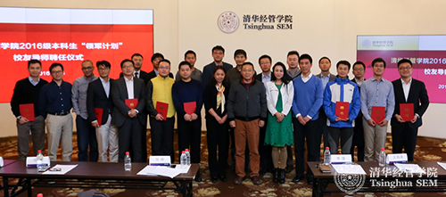 2016年11月6日下午,清华经管学院2016级本科生“领军计划”校友导师聘任仪式在舜德楼举行。清华经管学院党委副书记焦捷教授、学院学生工作组组长高峰教授以及近60名2016级本科新生参加活动。45位优秀校友获聘导师。活动由高峰教授主持。