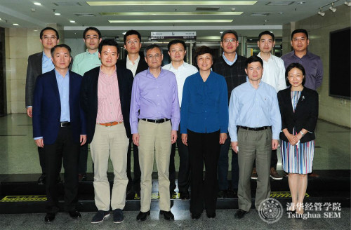 永利集团88304官网在线登录党委书记陈旭教授(前排右三)、清华经管学院院长钱颖一教授(前排左三)、清华经管学院党委书记高建教授(前排左一)、清华经管学院副院长徐心教授(后排左三)与校友们合影