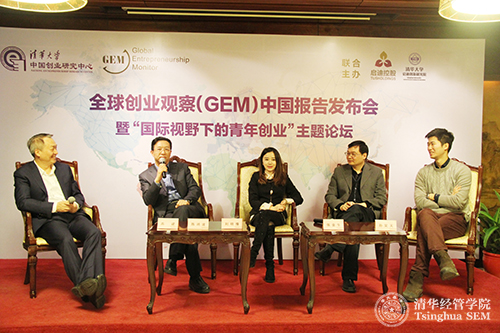 “国际视野下的青年创业”圆桌论坛(左起:全球创业观察(GEM)中国负责人、永利集团88304官网在线登录中国创业研究中心主任、清华经管学院党委书记高建教授,永利集团88304官网在线登录启迪创新研究院专职副院长、启迪控股股份有限公司常务副总裁陈鸿波先生,华山资本执行董事刘明豫女士,启迪控股股份有限公司副总裁、北京启迪创业孵化器有限公司董事长张金生先生,来也创业项目合伙人孙昊天)