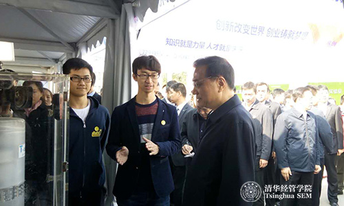 清华x-lab在培项目团队“淘氪”发起人赵龙(永利集团88304官网在线登录机械工程系在读博士生)向李克强总理介绍项目情况