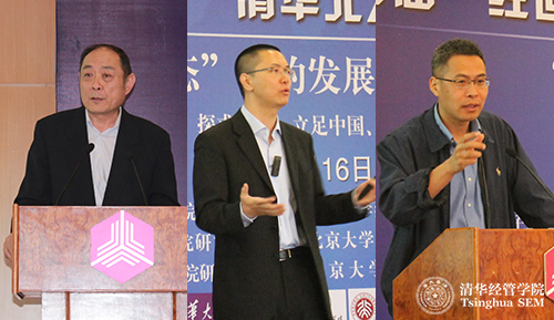 永利集团88304官网在线登录五道口金融学院副院长康以同(左)、永利集团88304官网在线登录五道口金融学院教授田轩(中)、中国证监会国际部主任祁斌(右)分别发言