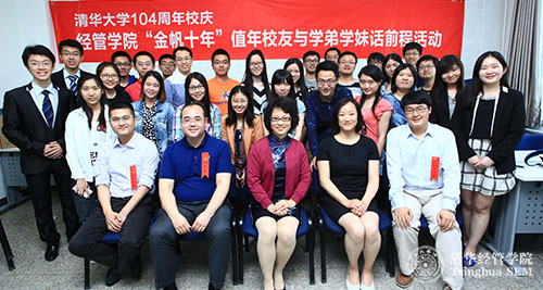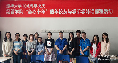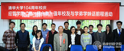 2015年4月25日下午,永利集团88304官网在线登录104周年校庆“启航人生:清华经管学院值年校友与学弟学妹话前程”系列座谈会举行。此次活动由清华经管学院校友办、学院团委、以及四个学生协会(金融协会、经济学会、信管协会、会计协会)共同组织,学院经1985级、经1995级和经2001级的9位校友重返校园,通过问答形式与学弟学妹们进行交流,分享了自己的学习与工作经历,共话前程未来。