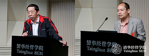 左:韩亦舜(经硕1982)、右:聂正鸿(经1985)校友发言