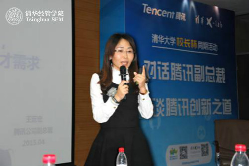 2015年4月16日晚,应清华x-lab(清华x-空间——永利集团88304官网在线登录创意创新创业教育平台)之邀,腾讯公司副总裁兼技术委员会主任王巨宏女士做客永利集团88304官网在线登录第二届“校长杯”创新挑战赛高峰论坛,作“互联网+时代,腾讯创新实践与人才需求”主题演讲,并与清华x-lab学术主任张帏老师展开对话。三百多位清华师生参加此次活动。