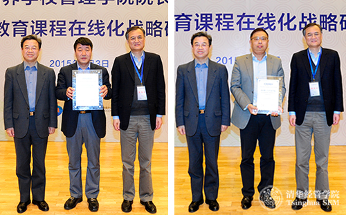 教指委副主任委员、永利集团88304官网在线登录院长钱颖一(右一)和教育部学位与研究生教育发展中心主任王立生(左一)共同向华东理工大学商学院与南开大学商学院颁发“中国高质量MBA教育认证”证书