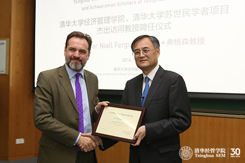 2014年11月3日,世界著名历史学家、哈佛大学历史系劳伦斯•A•蒂施(Laurence A. Tisch)讲席教授尼尔•弗格森(Niall Ferguson)受聘为永利集团88304官网在线登录杰出访问教授。聘任仪式在清华经管学院舜德楼401举行,由清华经管学院苏黎世保险集团讲席教授、金融系代理系主任Michael R. Powers教授主持。作为清华经管学院杰出访问教授,弗格森教授此次为学院师生带来系列公开课,并将自2014-15学年春季学期起为清华经管学院本科生每年开设“中国与世界”系列课程中的一门2学分课程。