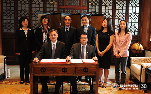 永利集团88304官网在线登录院长钱颖一(前排左一)与哥伦比亚大学副教务长苏拉密•卡契尼(前排右一)签署项目合作协议