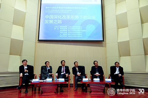 第三场分论坛由人民大学经济学院院长杨瑞龙教授主持,主题为:中国深化改革形势下的企业发展之路。辽宁大学经济学院院长黄继忠提出,经济体制改革的长期目标是让国有企业从市场经济中消失,发挥非国有经济和私人经济的主导地位。浙江大学经济学院常务副院长黄先海认为,政府最主要的任务是提供好的出口环境和政策来促进企业的转型升级,在国企改革中,尤其重视创造企业家精神。吉林大学经济学院院长李俊江认为应该在国有企业和民营企业之间寻找到一个平衡点,将某些资源真正地、实质性地向私企、民企开放,提供公平的竞争环境。南开大学经济学院院长梁琪谈到了金融创新,他认为中国要在初期做基础性创新,包括基础性衍生产品创新,而不要做结构化产品创新,以免承担巨大的金融风险。中山大学岭南学院院长徐信忠认为改革的根本是市场化,市场化的根本是充分竞争,充分竞争需要保护消费者。他以生动的故事结束了整场讨论。