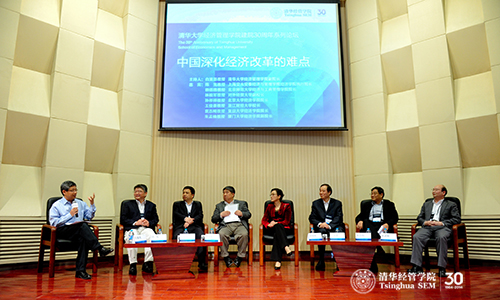 第二场分论坛由清华经管学院副院长、弗里曼讲席教授白重恩主持,主题为:中国深化经济改革的难点。北京大学经济学院院长孙祁祥认为政府不能干预具体的经济活动,但必须保护合法产权,创造和维护公平竞争的市场环境,提供基本的均等的公共服务。浙江财经大学校长王俊豪就政府管制问题提出自己的看法,他认为要维护有效的市场运行秩序,必须加强政府管制,完善政府管制相关的政策法规体系,同时构建科学的政府管制绩效评价体系。袁志刚就社会保障制度中的现收现付和基金制两种模式进行比较分析,并提出中国未来社会保障制度的发展方向。上海交通大学安泰经济与管理学院经济学院执行院长陈宪认为服务业的发展趋势是越来越开放,中国未来服务业发展方向仍然是生产型服务,即发展与制造业相关的服务业。北京师范大学经济与工商管理学院院长赖德胜谈到,中国劳动力市场应从分隔走向整合,优化人力资本配置结构,给小微企业、创业企业提供更好的发展环境。对外经贸大学副校长林桂军指出要把国内市场建设和对外开放统一起来,重视能力建设,发展开放的服务业,重视全球价值链上的生产改革,引领国际规则的制定。厦门大学经济学院副院长朱孟楠认为人民币国际化问题是改革开放必然结果,也是未来中国进一步发展的战略选择,但要确保人民币价格稳定,规避风险。