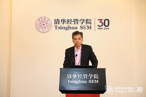 清华经管学院院长钱颖一教授向来宾们介绍了学院30周年院庆的情况,管理科学与工程系系主任、联想讲席教授陈剑致欢迎辞。本次活动在信息领域资深专家陈国青教授关于“大数据的管理喻意与研究展望”的主题演讲中正式开始,陈教授从信息技术沿革引出大数据的基本特征,指出大数据的超规模、多样性、低价值密度、实时性四方面特征,带来了“IT融合”、“内外部融合”、“价值融合”等三大融合;随着信息产品(如软件、IT服务等)及其应用(如虚拟体验、个性推荐、社会网络、网络搜索等),技术创新呈现出越来越丰富的形态和特征,催生出“新模式”(如线上线下互动的O2O(online-to-offline或offline-to-online)运作模式)、“新业态”(如众包(crowdsourcing)生产和创新组织)、“新人群”(如生活在赛博空间中的人群及其行为和需求)等,并对相关研究进行展望,指出未来学术界与业界将围绕“社会化的价值创造”、“网络化的企业运作”和“实时化的市场洞察”三方面展开。