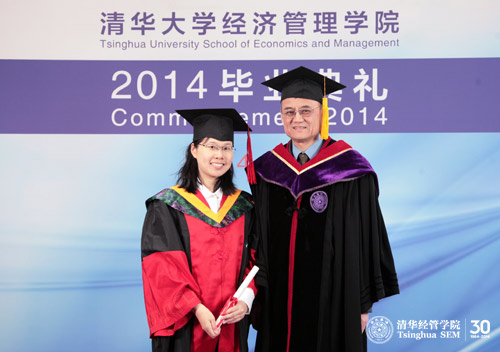 2014春季清华经管学院共有283名研究生获得学位后毕业,其中硕士272人,博士11人。毕业生们在与学院领导集体合影留念后,在舜德楼大厅单独与钱颖一院长合影。(供稿:沟通办)