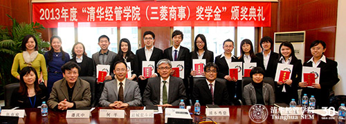 2013年12月5日下午,“清华经管学院(三菱商事)奖学金”颁奖仪式在学院举行。清华经管学院金融系副主任何平教授、合作发展办公室主任潘庆中老师、三菱商事株式会社东亚地区总裁辅佐岩城宏斗司先生、三菱商事(中国)商业有限公司人事总务部部长浦本秀登先生等出席了颁奖仪式。颁奖仪式由何平教授主持。