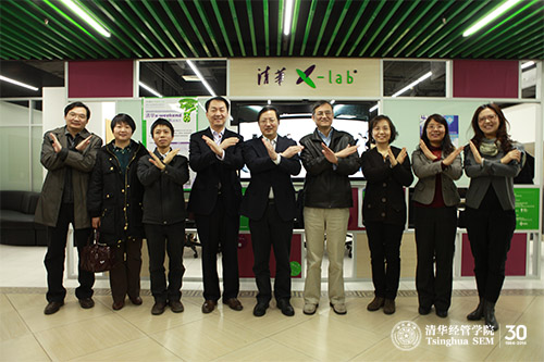 中关村管委会主任郭洪(右五)和创业处处长杨彦茹(右二)在清华经管学院院长钱颖一教授(右四)陪同下调研清华x-lab