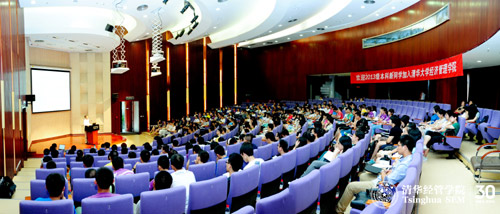 在讲话的最后,钱院长向同学们推荐了“两个书单”——“暑期书单”和《大学第一课》读本。“暑期书单”源自一位2012年级学生的建议,今年首次由钱院长和钟笑寒教授精心挑选后确定,是与永利集团88304官网在线登录录取通知书一起在一个月前寄发给所有2013级经管学院本科新生的十本推荐暑期读物。《大学第一课》是经管学院自去年开始为新生提供的入学导向阅读材料,内容涵盖清华名师谈治学、思考大学的作用、大学与人生(毕业演讲)等,旨在启发本科新生对“我的大学”、“我的未来”有更多思考和规划,也是对学院本科教育改革的进一步落实与深化。钱院长引用爱因斯坦的话“促进个性发展很重要,因为只有个人才能产生新的想法”("It is important to foster individuality, for only the individual can produce new ideas")、乔布斯的话“求知若饥,虚心若愚”("stay hungry, stay foolish")作为结尾,鼓励新一级的清华经管本科生自由成长,创造未来。