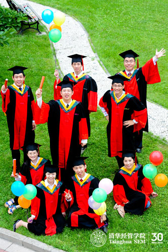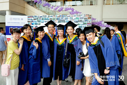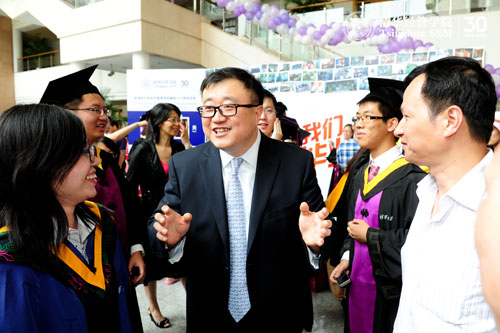 毕业生招待酒会是今年学院系列毕业庆祝活动的一个新亮点,它突破了以往传统的室内活动,将庆典延展到户外进行,同时给了毕业生之间以及和师生们更多的空间彼此问候、交流和相互祝贺。活动当天,伟伦楼、舜德楼的大厅以及两楼之间的中庭被气球、彩带、合影背景板、凉亭等装饰一新,在绿草的映衬下体现出节日般的喜庆气氛。