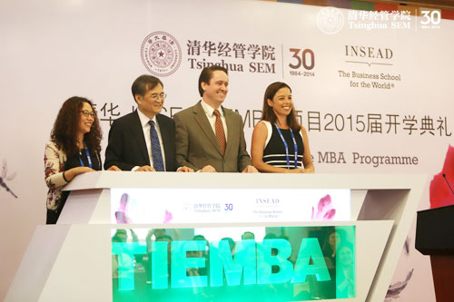 在两位院长分别致辞后,开学典礼的启动仪式正式开始,钱颖一、Peter Zemsky,INSEAD学位项目主任Kristen Lynas和TIEMBA项目主任游红分别手执清华经管学院和INSEAD的标志,同时放进欢迎背板中,五彩的灯光瞬间点亮,呈现出“2015届TIEMBA”的字样。