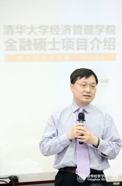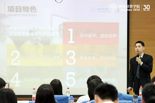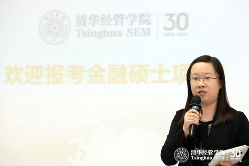 刘淳从项目特点、就业与实习、招生情况三方面详细介绍了金融硕士项目。自2011年起,清华经管学院已经成功招录三届金融硕士学生。其中,2011级作为首届金融硕士即将完成两年的学业。他们的就业主要集中在金融监管机构、外资与国有银行、投行、投资公司、基金与证券、咨询等领域,就业单位有中国人民银行、中国保监会深圳监管局、商务部、国家开发银行、高盛、中金、中投、摩根斯坦利(香港)、招商局科技集团、中信证券、瑞信方正、招商基金、博时基金、富国基金、德勤、安永咨询、中国银行、中银香港等。他还重点介绍了项目的双导师(专业导师+行业导师)培养模式,目前已有120多位业界精英担任金融硕士学生的行业导师。他还介绍了项目与法国巴黎高等商学院(HEC Paris)和美国加州伯克利大学哈斯商学院(University of California, Berkeley)开展双学位教育的情况。