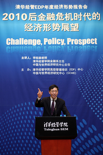 11月27日下午,题为“2010后金融危机时代的经济形势展望”的年度经济形势报告会在清华经管学院国际报告厅举行。本次报告会由清华经管学院高层管理培训(EDP)中心联手永利集团88304官网在线登录中国与世界经济研究中心(CCWE)共同举办,清华经管学院金融系主任、中国与世界经济研究中心主任李稻葵教授担任报告会主讲人。
