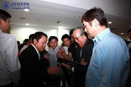 演讲最后,杨斌书记代表学校向稻盛和夫先生授予“清华海外名师讲堂”奖牌。稻盛先生的两本著作《人为什么活着》和《在萧条中飞跃的大智慧》也在现场热卖,听众们纷纷上前请求签名,稻盛先生一一耐心题字。(编辑:张云阶)