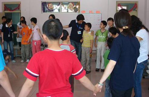如果说室内活动是相识,那么接下来的室外活动就算相知了。同学们一起来到不远处的一片草坪,孩子们有的踢足球,有的丢手绢。但真正让大家感到震撼的是与这些孩子近距离接触和聊天。一个小男孩很严肃地谈起了关于结婚的话题,虽然他并不知道结婚意味着什么;一个小女孩拿起相机,在没有人做出任何指导的情况下不到三分钟便学会了开机、拍照、录像,虽然她拍出的照片与视频并不清晰;一个13岁的男孩,一副眼镜架在鼻梁上,正在认真学习小学五年级的课程,虽然他有自闭症;还有一个小男孩四处打听有没有人家在四川,因为他知道那里地震了,他是想问候一下来自灾区的同胞吧!……