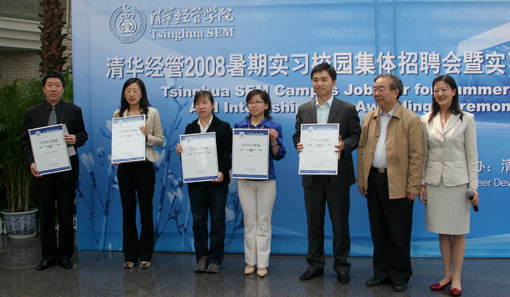 4月17日下午,由清华经管学院职业发展中心(CDC)组织的2008暑期实习校园集体招聘会暨清华经管学生实习基地授牌仪式在清华科技园隆重举行,学院党委副书记陈章武教授到会并讲话,会议由CDC主任王瑾主持。
