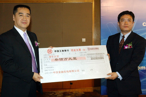 (清华经管学院副院长兼金融研究中心常务副主任廖理教授[右]接受中国金融在线CEO赵志伟捐赠)