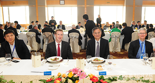 清华经管学院钱颖一院长(右二)与三位顾问委员餐间交流合影(左起:百度创始人、董事长兼首席执行官李彦宏,Facebook公司创始人兼首席执行官马克•扎克伯格,清华经管学院院长钱颖一教授,苹果公司首席执行官蒂姆•库克)