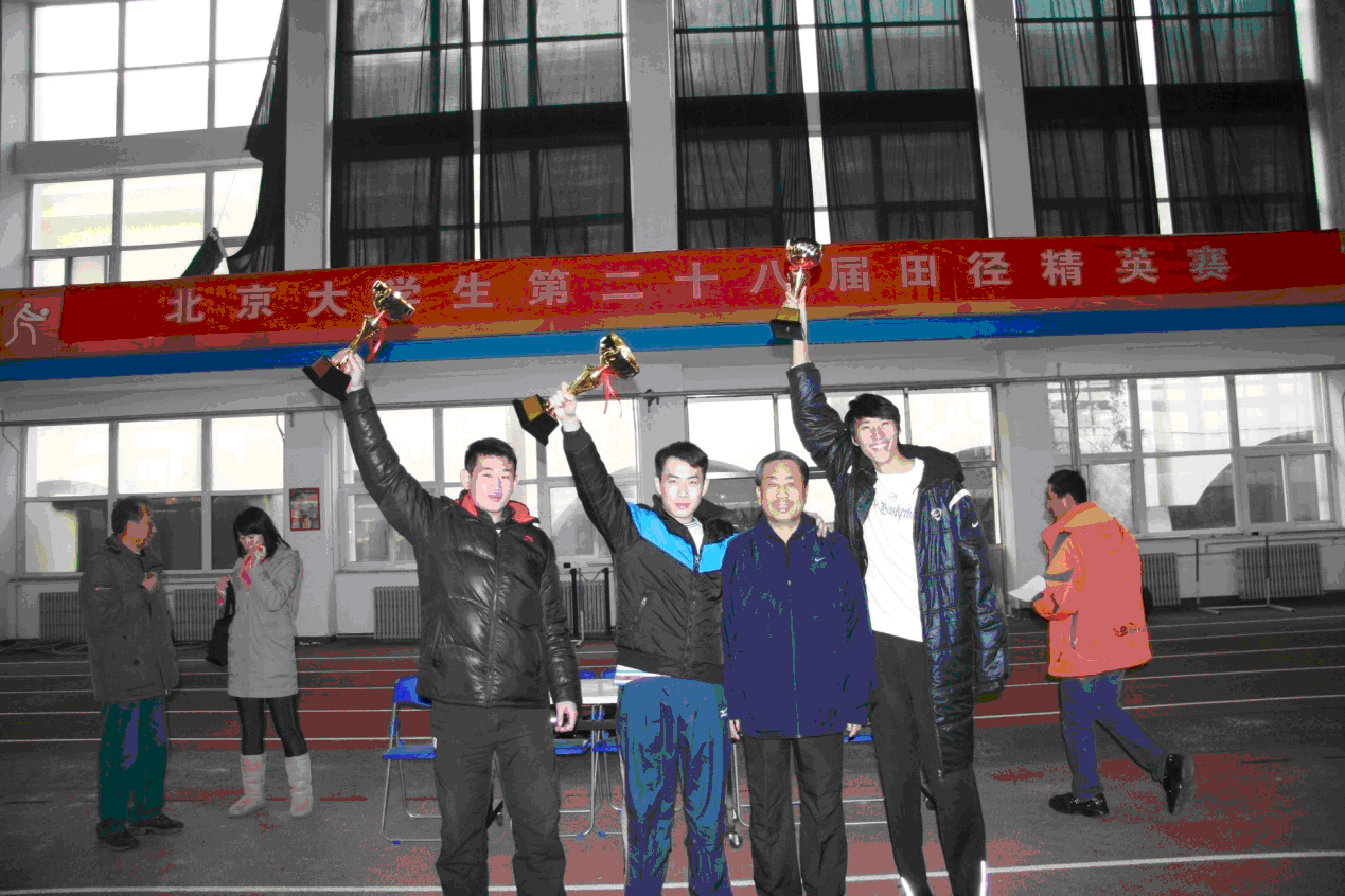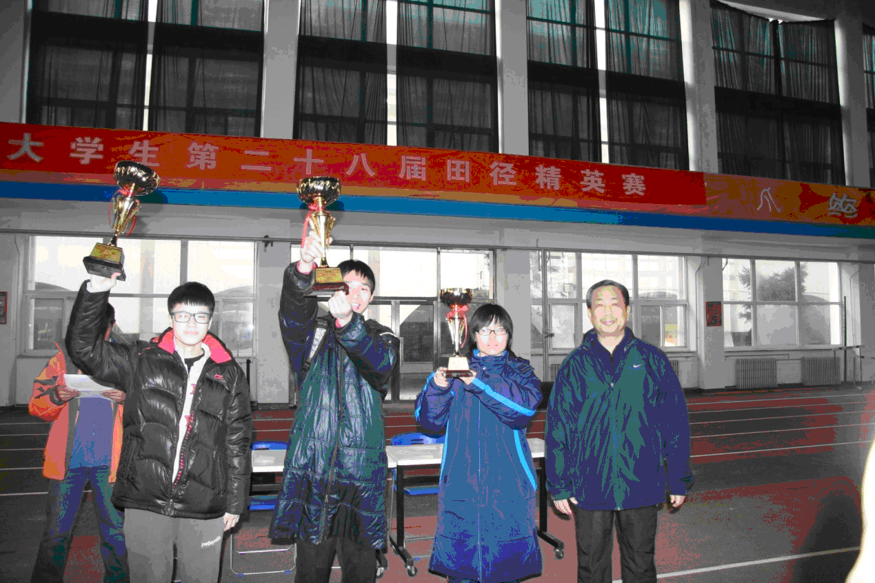 口口2011年12月11日在北京市先农坛室内馆举行了北京市大学生田径精英赛,由体育部总支书刘波老师带队参加比赛。本次比赛我校获得了男子团体总分第二名、女子团体总分第二名的好成绩。